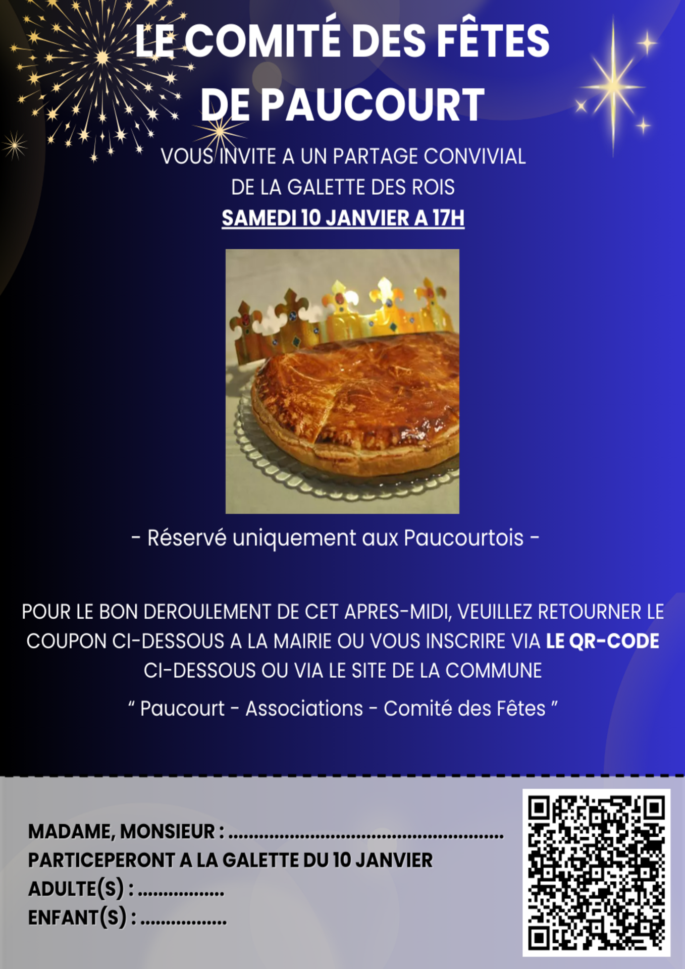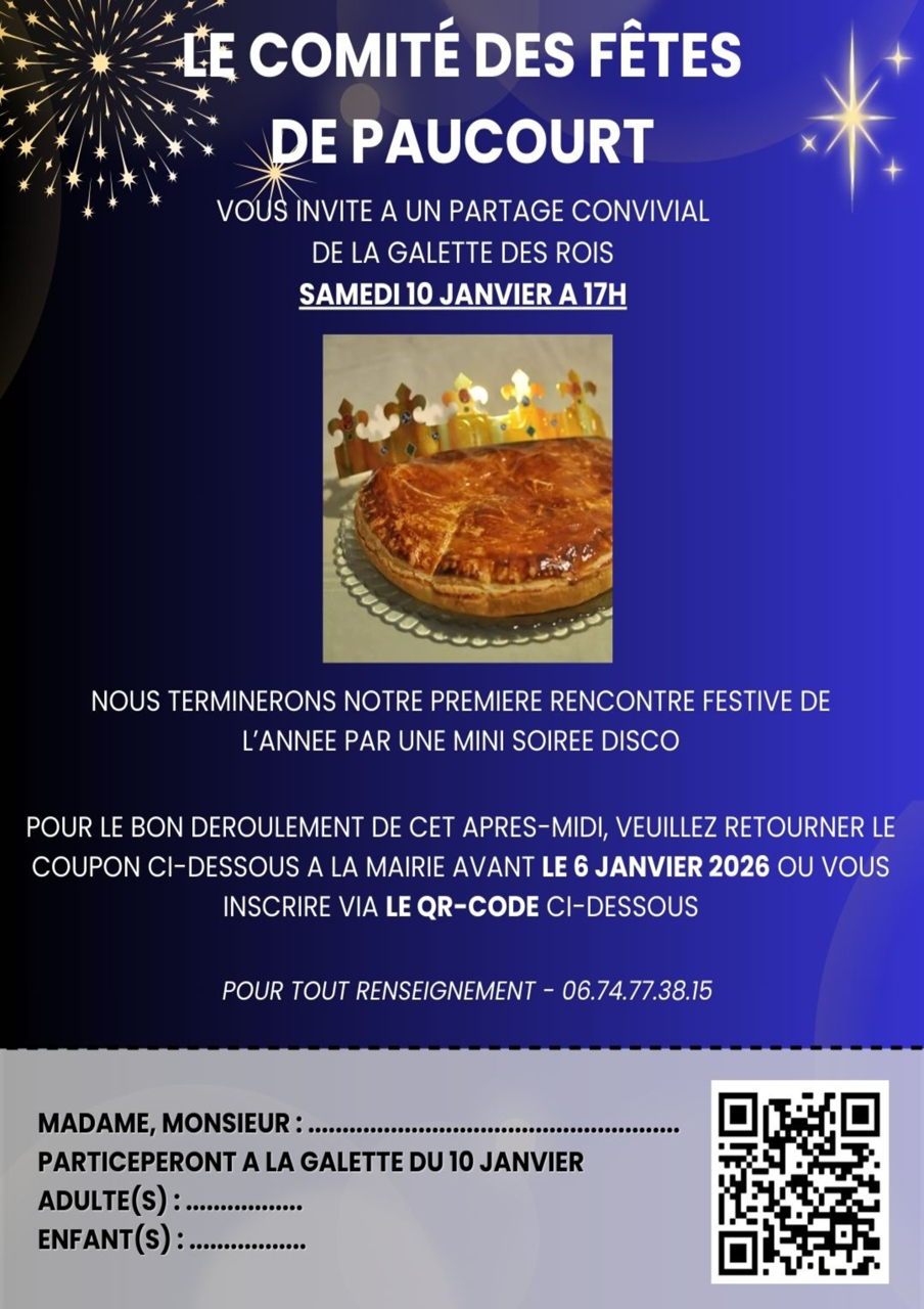 - Samedi 10 Janvier : Soirée Galette + mini soirée Disco (réservé aux paucourtois)